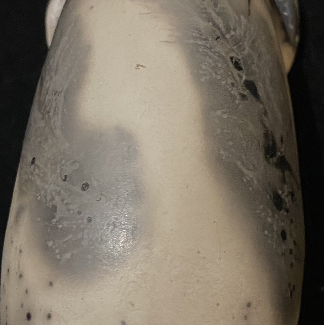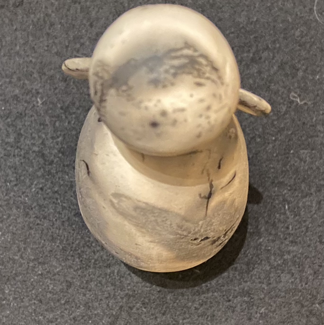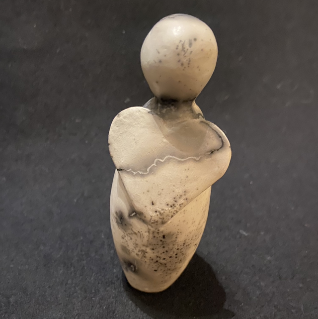 This piece has been hand built using the pinching process, using Ashraf Hannah clay. Ashraf Hannah clay is a beautiful white colour and highly grogged or textured, the grog is essential in the Raku firing, adding strength to the clay to absorb the thermal shock.