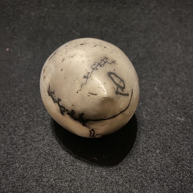 Goose down feathers are printed onto the red hot clays surface along with horse tail hair and sugar, the carbon print is absorbed into the clays surface, in the alchemy of the Raku firing.