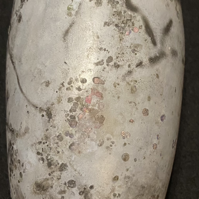 Combustibles are placed in a foil parcel, this piece used copper carbonate, cobalt oxide, seaweed, Himalayan rock salt and miracle gro as the heat grows in the barrel firing these combustibles burn and smoulder, the clay absorbing these in the alchemy of the firing.