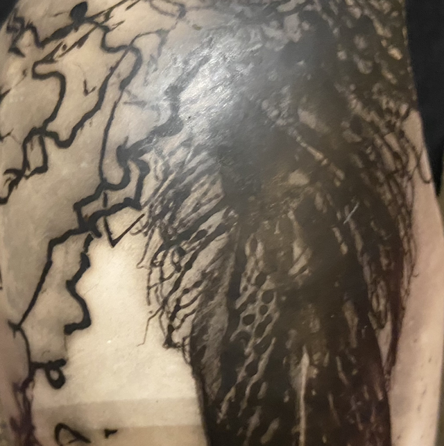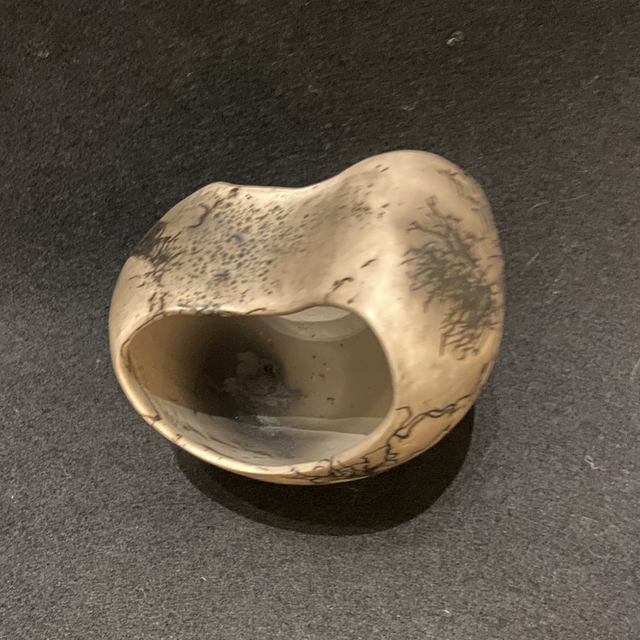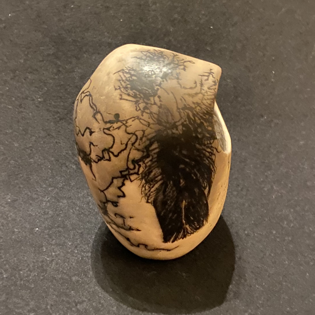 Goose down feathers are printed onto the red hot clays surface along with Horse tail hair and sugar, the carbon print is absorbed into the clays surface, in the alchemy of the Raku firing.