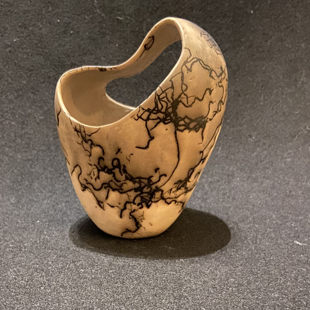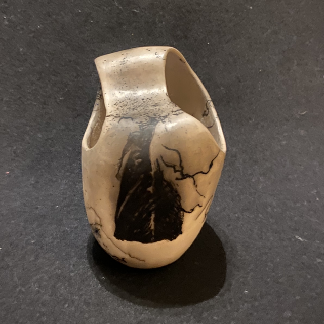 This piece has been hand built using the coiling process, using Ashraf Hannah clay. Ashraf Hannah clay is a beautiful white colour and highly grogged or textured, the grog is essential in the Raku firing, adding strength to the clay to absorb the thermal shock.