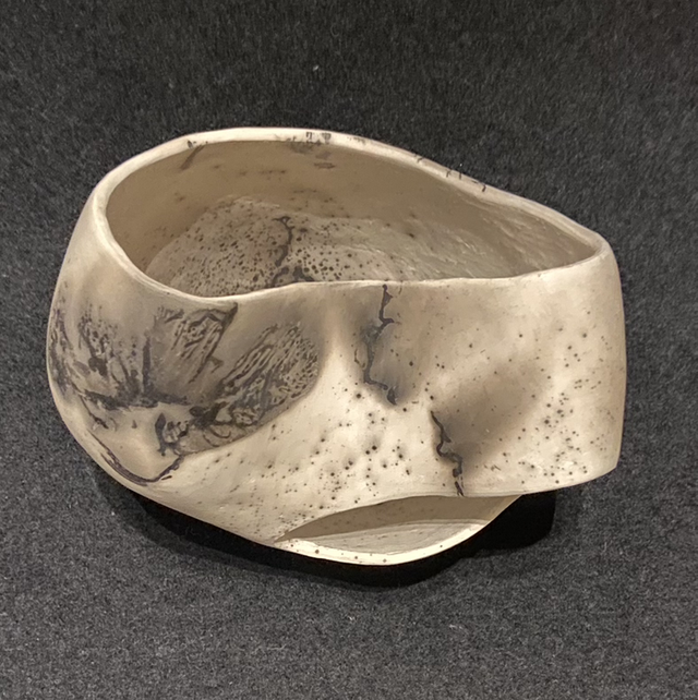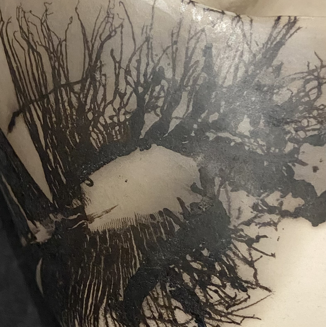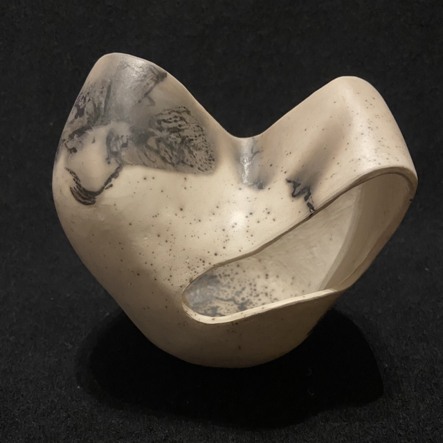 Goose down and ostrich feathers are printed onto the red hot clays surface along with Horse tail hair and sugar, the carbon print is absorbed into the clays surface, in the alchemy of the Raku firing.