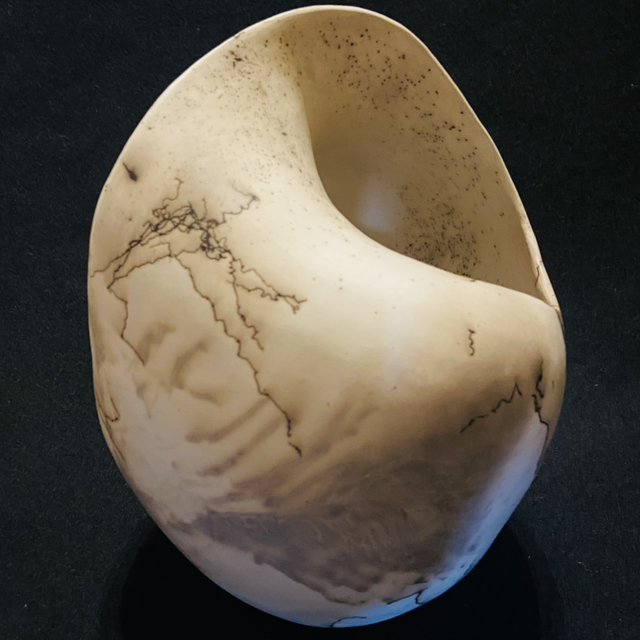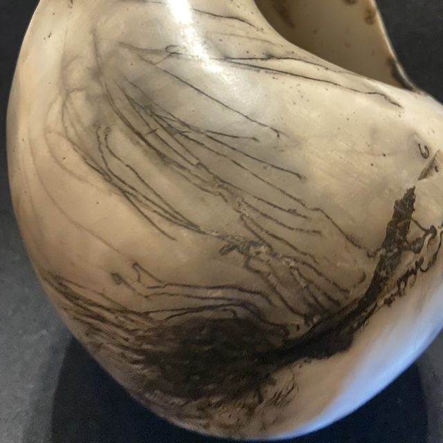 This piece has been hand built using the coiling process, using Ashraf Hannah clay. Ashraf Hannah clay is a beautiful white colour and highly grogged or textured, the grog is essential in the Raku firing, adding strength to the clay to absorb the thermal shock.