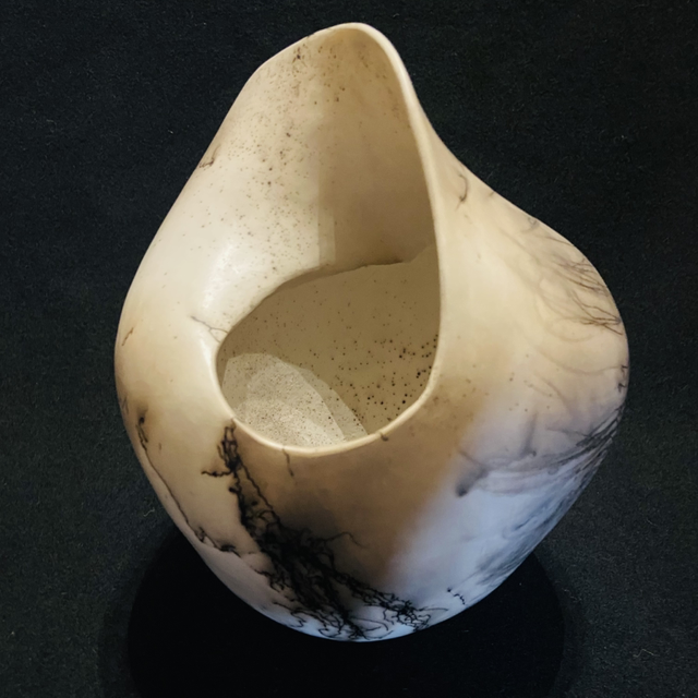 Peacock and ostrich feathers are printed onto the red hot clays surface along with Horse tail hair and sugar, the carbon print is absorbed into the clays surface, in the alchemy of the Raku firing. Raku Emotion Form, hand built by Fiona Newby