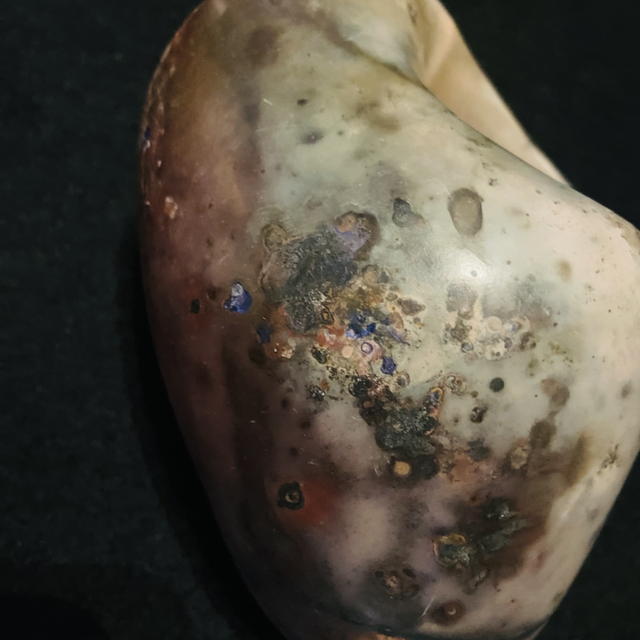 Combustibles are placed in a foil parcel, this piece used copper carbonate, cobalt oxide, seaweed, Himalayan rock salt and miracle gro as the heat grows in the barrel firing these combustibles burn and smoulder, the clay absorbing these in the alchemy of the firing.