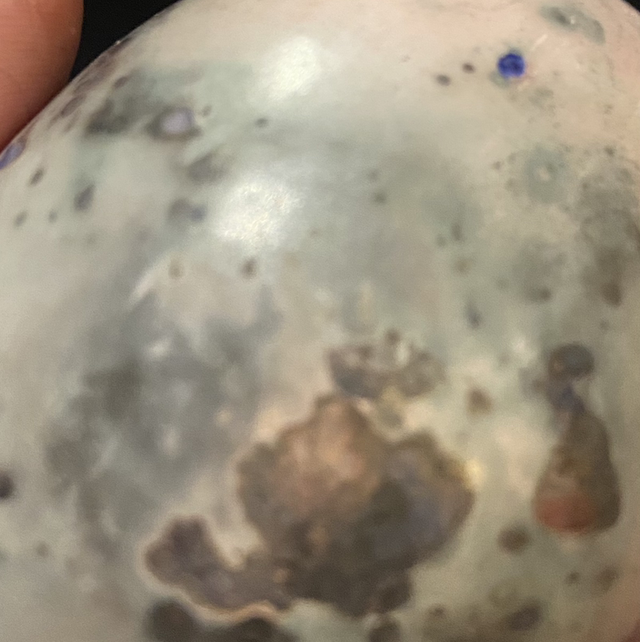 Combustibles are placed in a foil parcel, this piece used copper carbonate, cobalt oxide, seaweed, Himalayan rock salt and miracle gro as the heat grows in the barrel firing these combustibles burn and smoulder, the clay absorbing these in the alchemy of the firing.